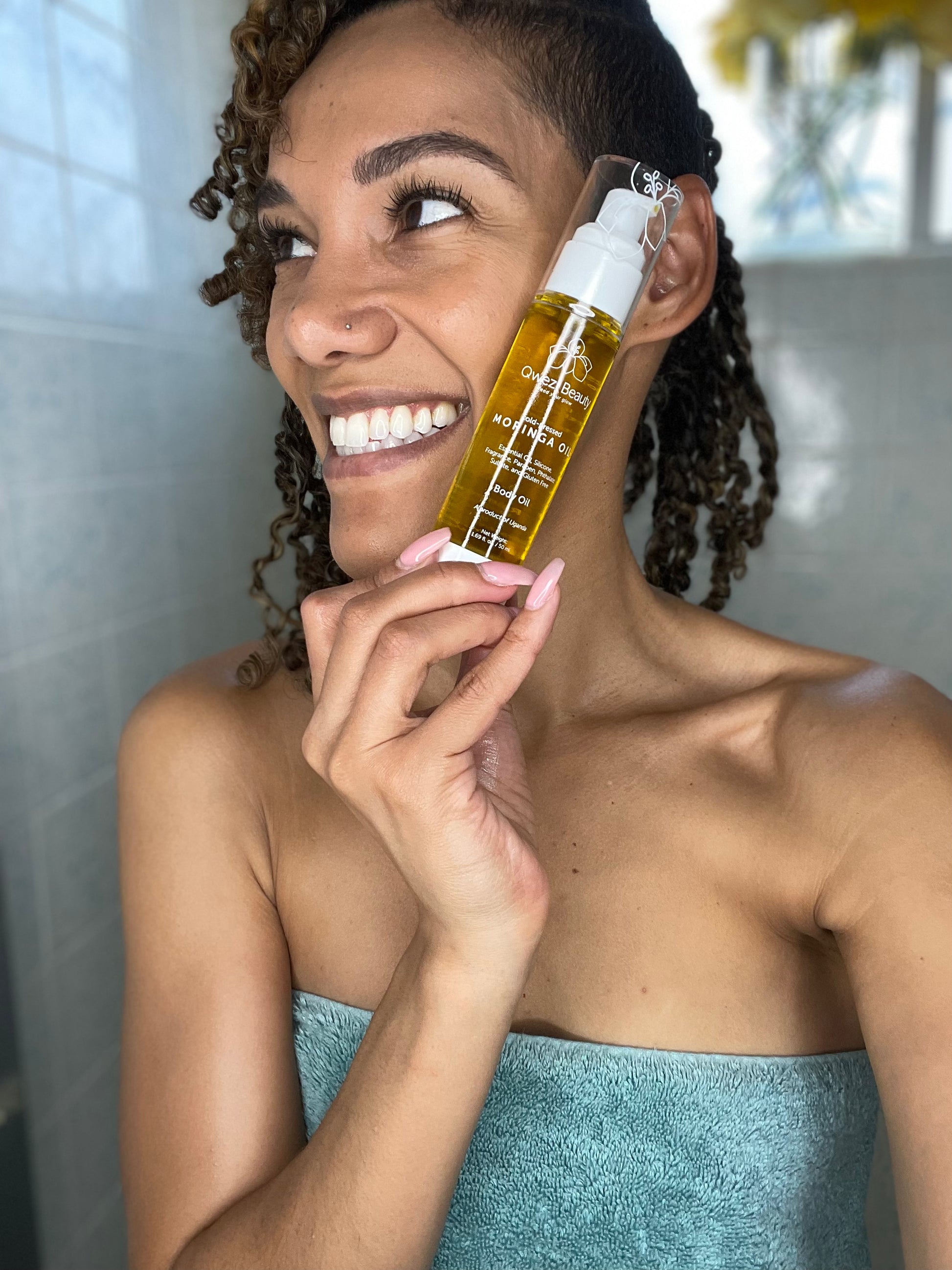 Our Virgin Moringa Oil is processed from the seed of the moringa tree grown by small organic family farms in Masindi Uganda. Pressed straight from the seed, our pure, unrefined moringa oil is free of additives and fragrance (chemical or otherwise!) Qwezi Beauty uses a cold-extraction and filtration process that preserves all the powerful benefits of pure Moringa Oil